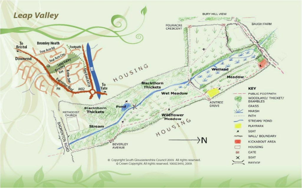 Leap Valley is a public open space and a site of Nature Conservation Interest in Downend, north-east of Bristol, close to the M32. It is owned by South Gloucestershire Council and managed by the Friends of Leap Valley. It is one of a series of countryside and open spaces that link Emerson’s Green with the valley of the River Frome, creating a wonderful wildlife corridor. Leap Valley is also a gateway to the Forest of Avon – an area of over 200 square miles of land in and around Bristol gradually being transformed with the help of communities into places for wildlife, access, leisure and learning.