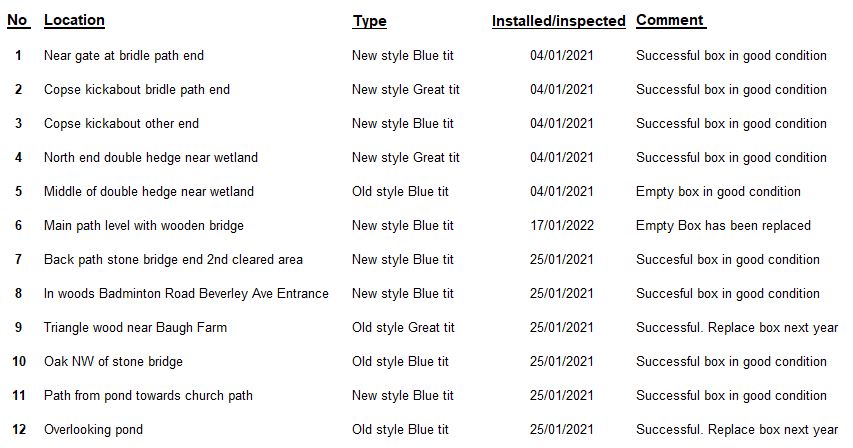Latest bird box survey Posted on January 24, 2022 by Ian Knight A very successful year for our birdboxes! Share this: Click to share on X (Opens in new window) X Click to share on Facebook (Opens in new window) Facebook Like Loading... Related