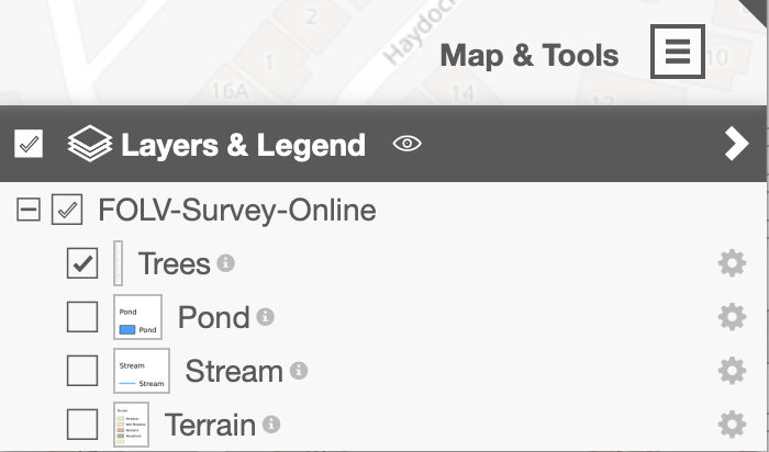 The top-right of the map shows a ‘Map and Tools’ facility, which when clicked, can be used to show or hide the trees, or different features within the valley including the stream and different area of terrain, such as the wet meadow and wooded area. Additional map tools are available to allow the measuring of distances between trees on the map or pinpointing their exact location etc.