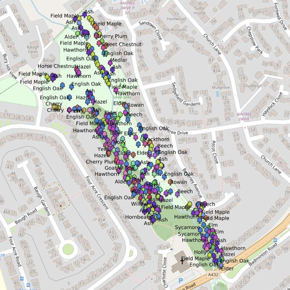As part of the survey, key tree data such as location, species, condition height and girth were recorded and then entered onto a spatial database application. On completion of the survey, the resulting data was converted into a format that could be made available to the public via the Friends of Leap Valley website.