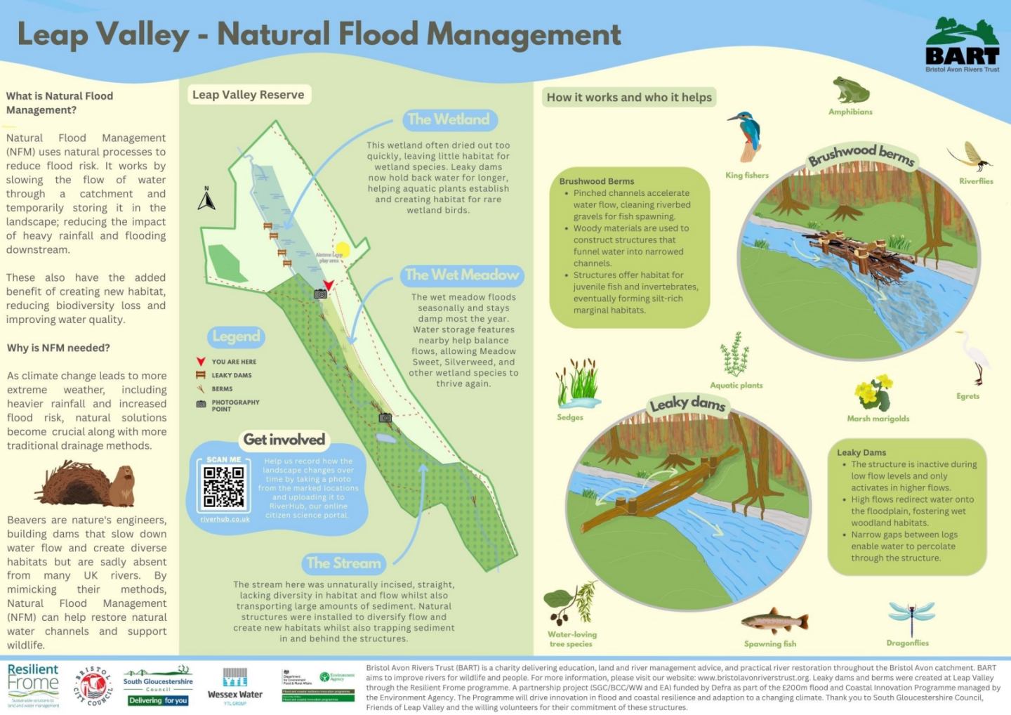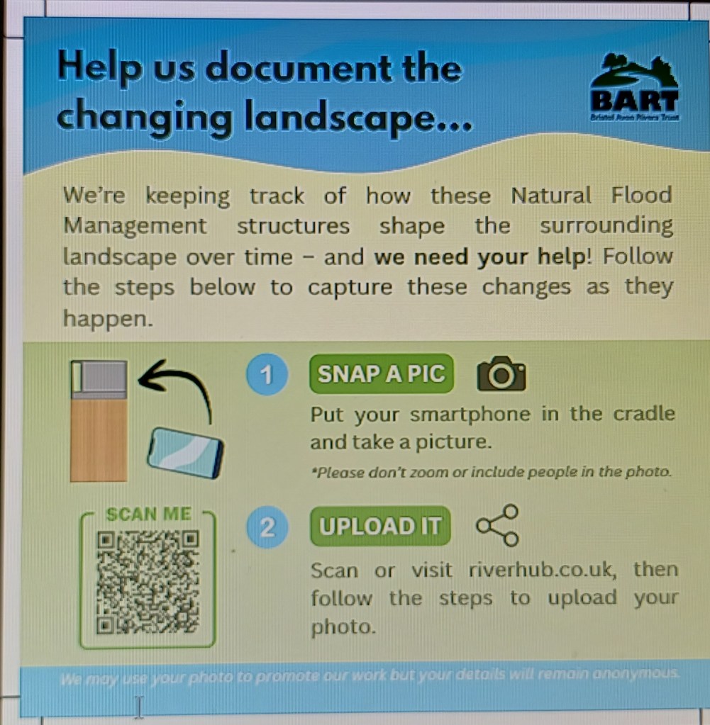 If you have been out in the Valley recently you may have noticed laminated boards at the fence overlooking the Wetland and on the Wooden Bridge. These have been erected by BART to hopefully get the users of the valley to participate in monitoring the effect the Leaky Dams and Berms installed last year are having. Our Wetland is one of the areas chosen by the Resilient Frome Project. The remit is to restore more natural flow patterns in heavily modified urban tributaries and implement nature-based flood management solutions across North Bristol.